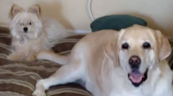This cat is clearly a well-trained assassin. I love the way the dog looks up at the person filming with the look, 'you just had to get a cat, didn't you.'