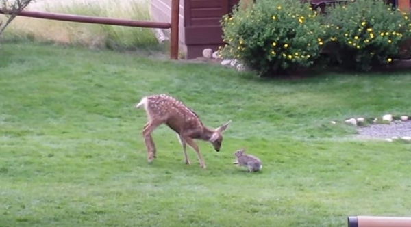 Two volunteers at YMCA of the Rockies captured this adorable video of a baby deer and bunny rabbit playing together.