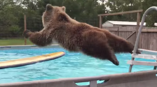 Watch This Bear Climb The Ladder And Belly Flop Into A Swimming Pool!