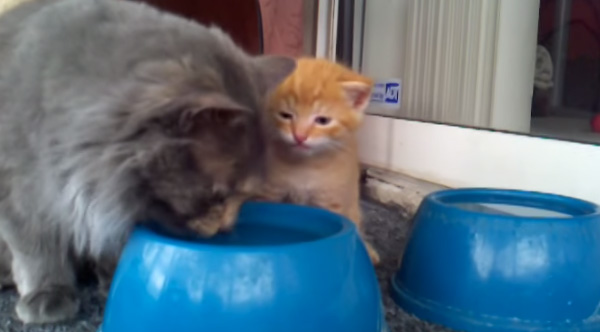 Momma Cat Teaches Kitten How To Drink. The Face It Makes Is Priceless!