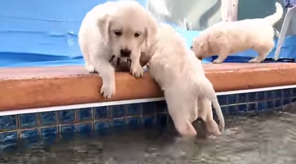 Eight Golden Retriever Puppies Swim For The First Time. I Love The Different Levels Of Curiosity