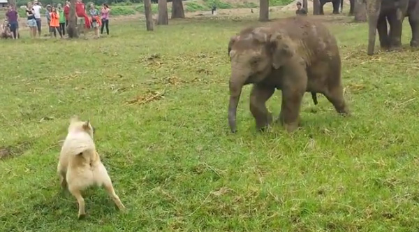 Watch What This Baby Elephant Does Once It Realizes It Can't Catch The Dog
