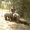 A wildlife camera catches a group of bears dancing together around a tree.