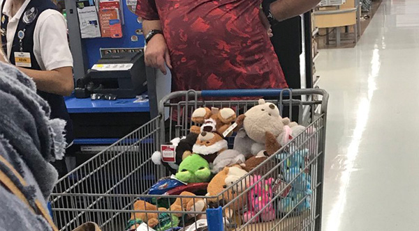 A photo of a man with a cart full of stuffed animals is touching the hearts of many.