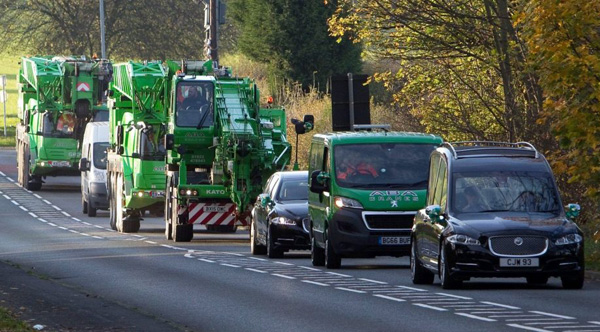 A crane service in Essington, England, honored a local man who loved cranes by sending four machines to participate in his funeral procession.