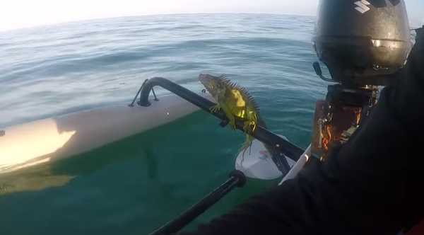 Steve was coming in from an offshore fishing trip and noticed a weird shaped object floating in the distance. It was no fish, but an iguana 4 miles offshore.