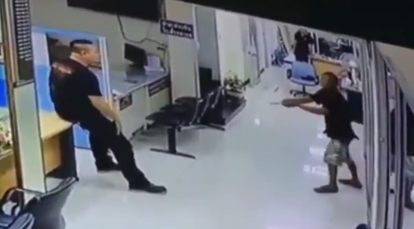 The police officer in this security camera footage provides an exceptional example of how to calm a potentially violent situation.