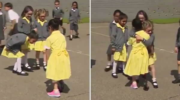 Those hugs! A seven-year-old girl shows her friends at school her new prosthetic leg for the first time and their reaction is beautiful.