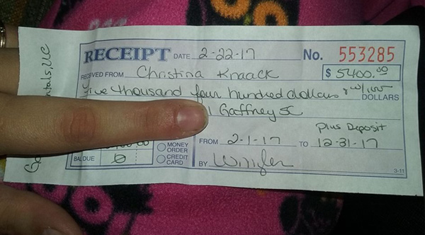 A South Carolina mom shared a photo on Wednesday of a receipt for $5,400 she spent on rent for the remainder of 2017. She never expected what would happen next.
