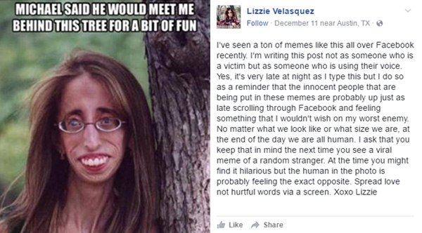 Lizzie Valasquez has fired back after coming across a meme featuring her image.