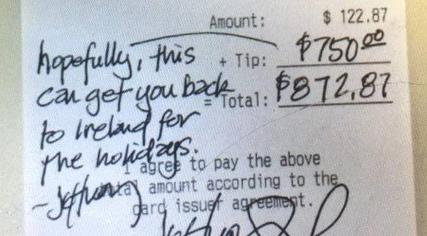 Customer Leaves Irish Waiter $750 Tip To Fly His New Family Home For Christmas