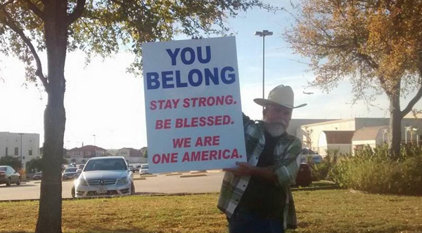 A photo of a Texas man holding up a sign outside of a mosque is going viral for all the right reasons.