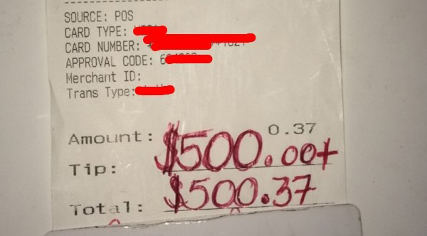 A customer at a Dallas Applebee's restaurant left her waiter a $500 tip on a $0.37 bill. A note, written on a napkin explained why.