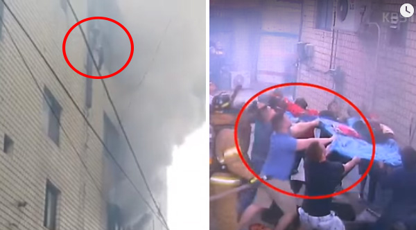 American servicemen in South Korea helped coordinate an extraordinary rescue as women and babies were dropped from the fourth story of a burning building into a safety blanket.