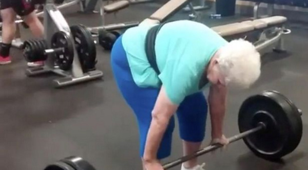 A video of a 78-year-old woman lifting 225 pounds of weights in a gym has already been liked 75,500 times.