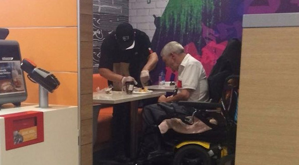 McDonald's Employee Steps Away From The Register To Help An Elderly Man Cut And Eat His Food