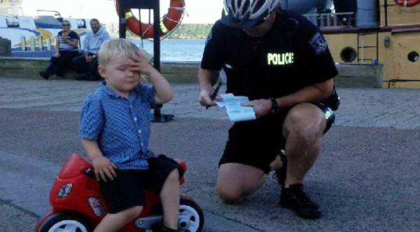 Declan Tramley, who loves riding his red plastic motorcycle, put his hand to his forehead in exasperation when he was caught by Officer Shawn Currie leaving his bike in a 'no-parking zone' on Sunday.