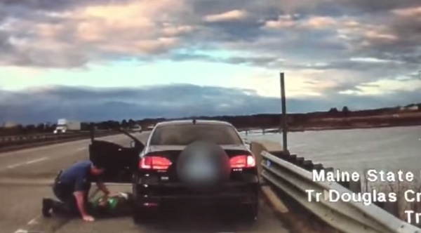 Dramatic dashcam footage shows the moment a Maine state trooper pulled a speeding driver over - and saved him from a fatal heroin overdose.