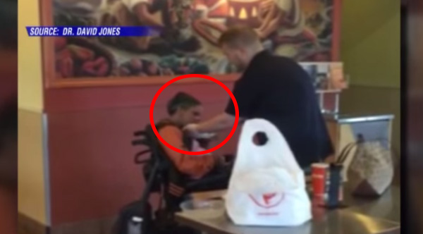 A small act of kindness from an employee at a fast food restaurant has gone viral after a customer secretly recorded him helping a woman with disabilities eat her food.