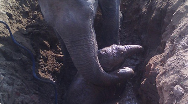 A mother elephant spent 11 hours desperately trying to pull her baby free from a muddy well before villagers lend her a helping hand.